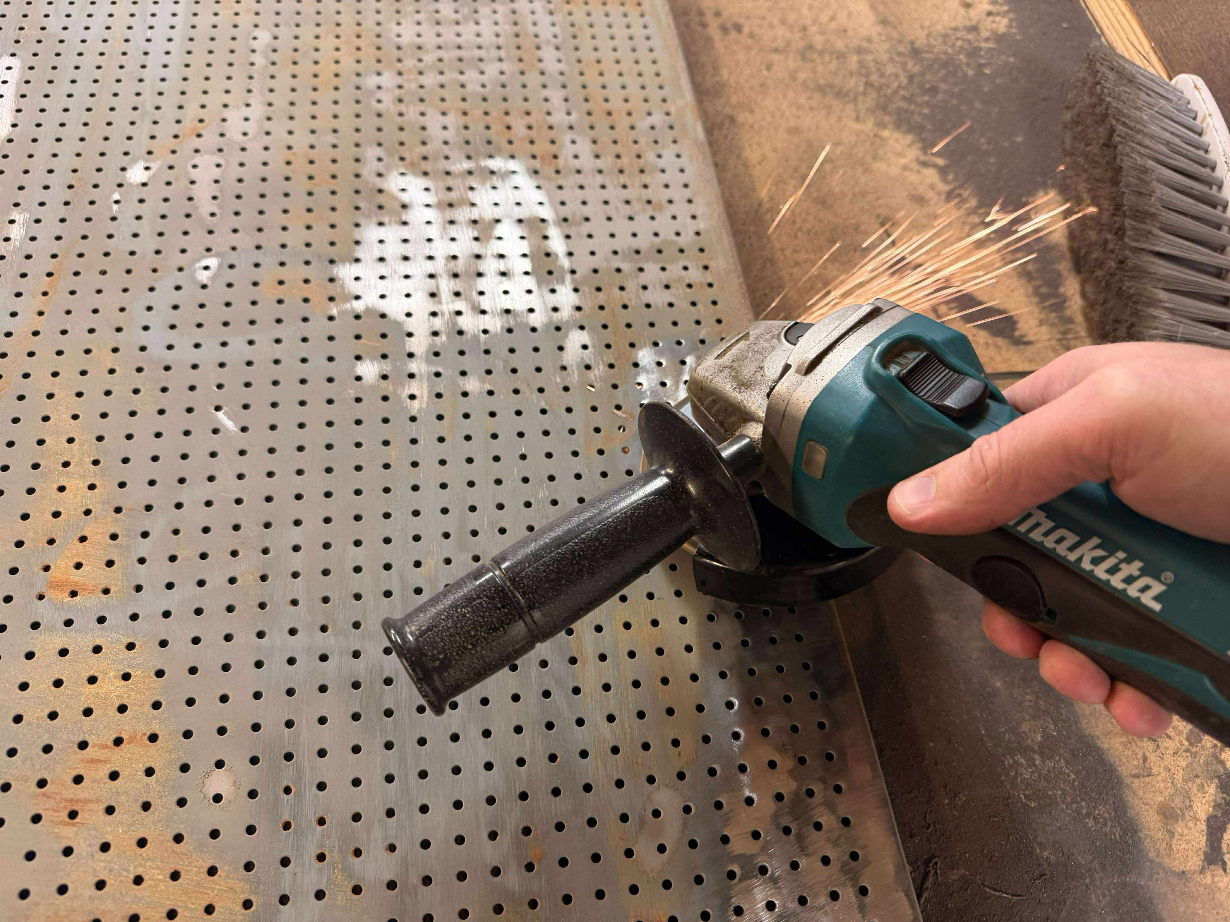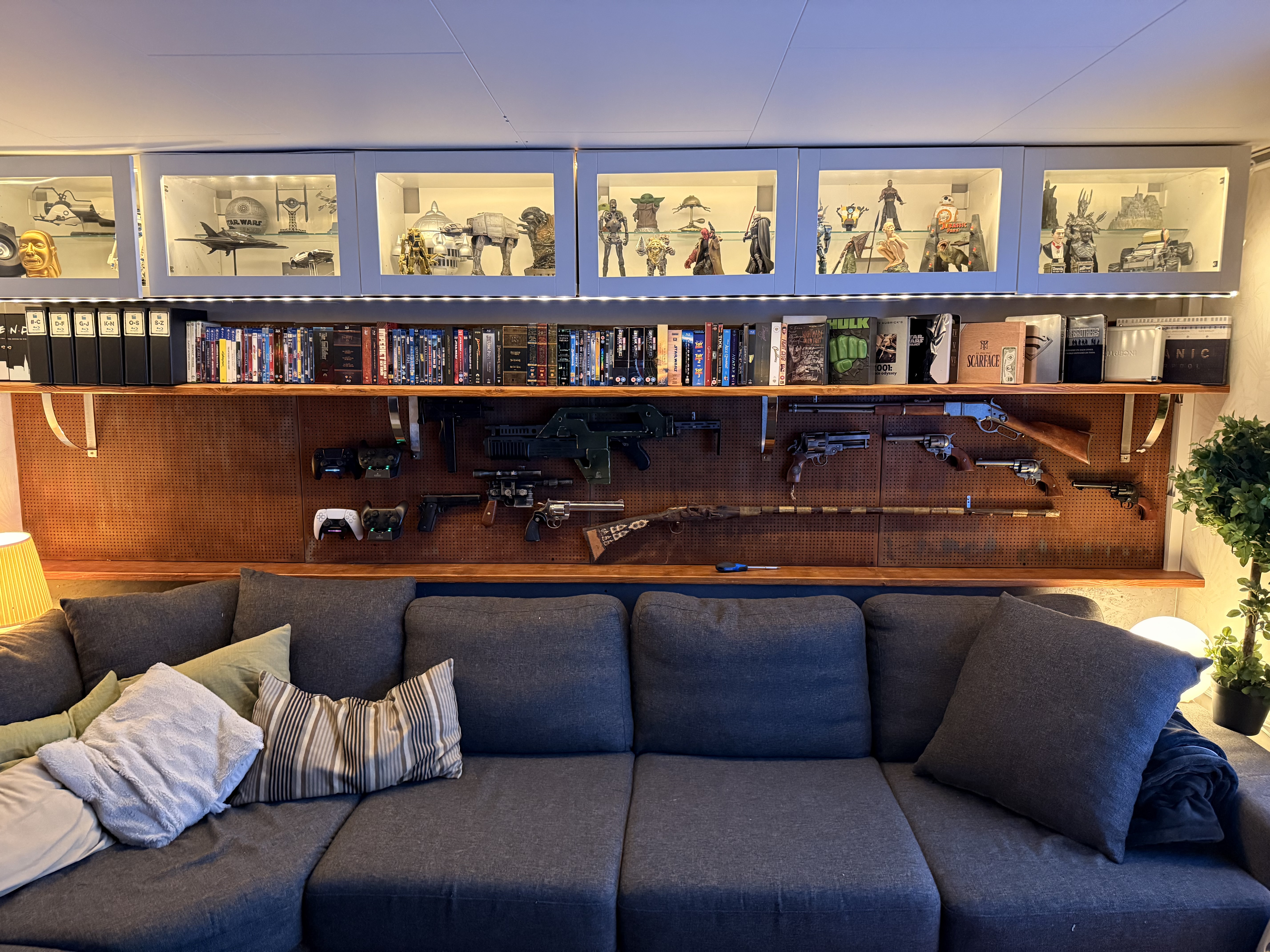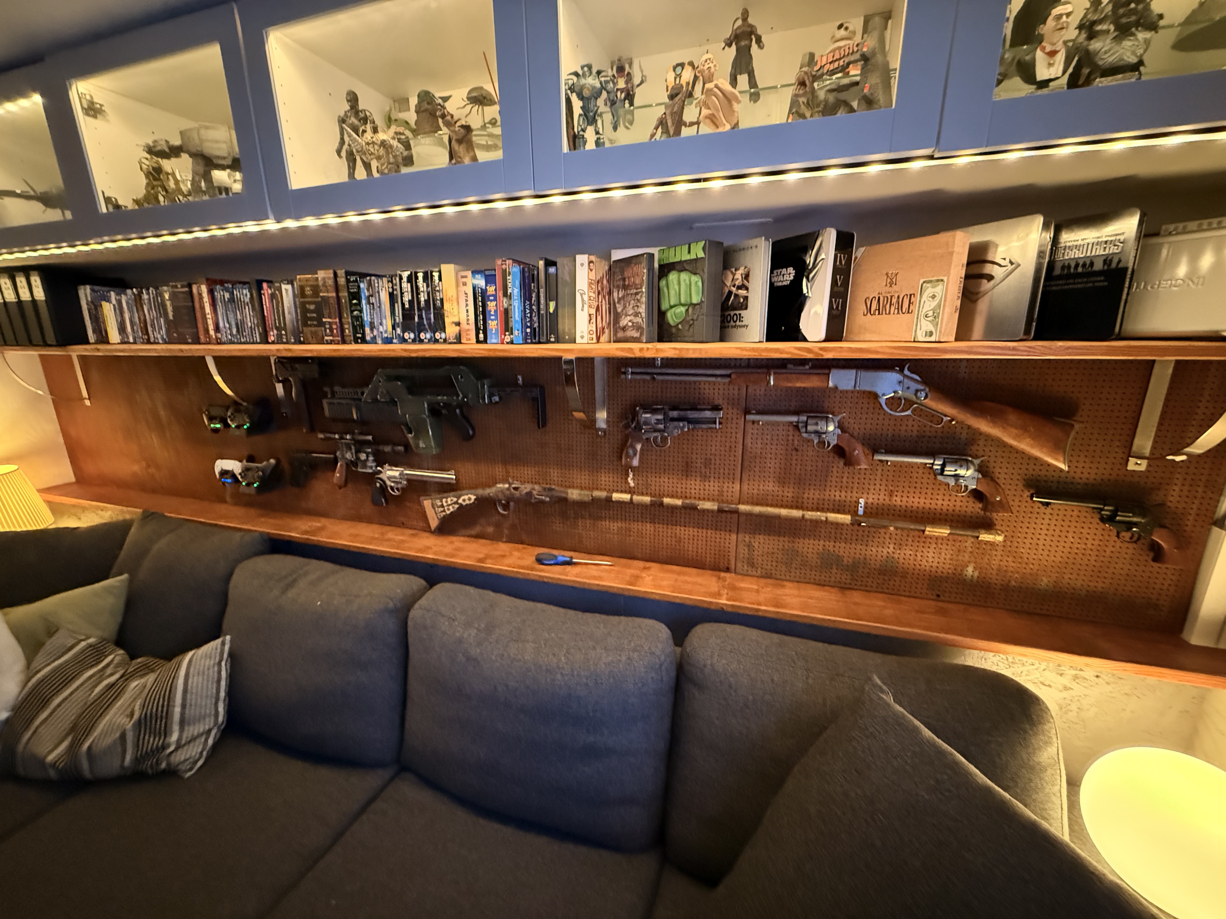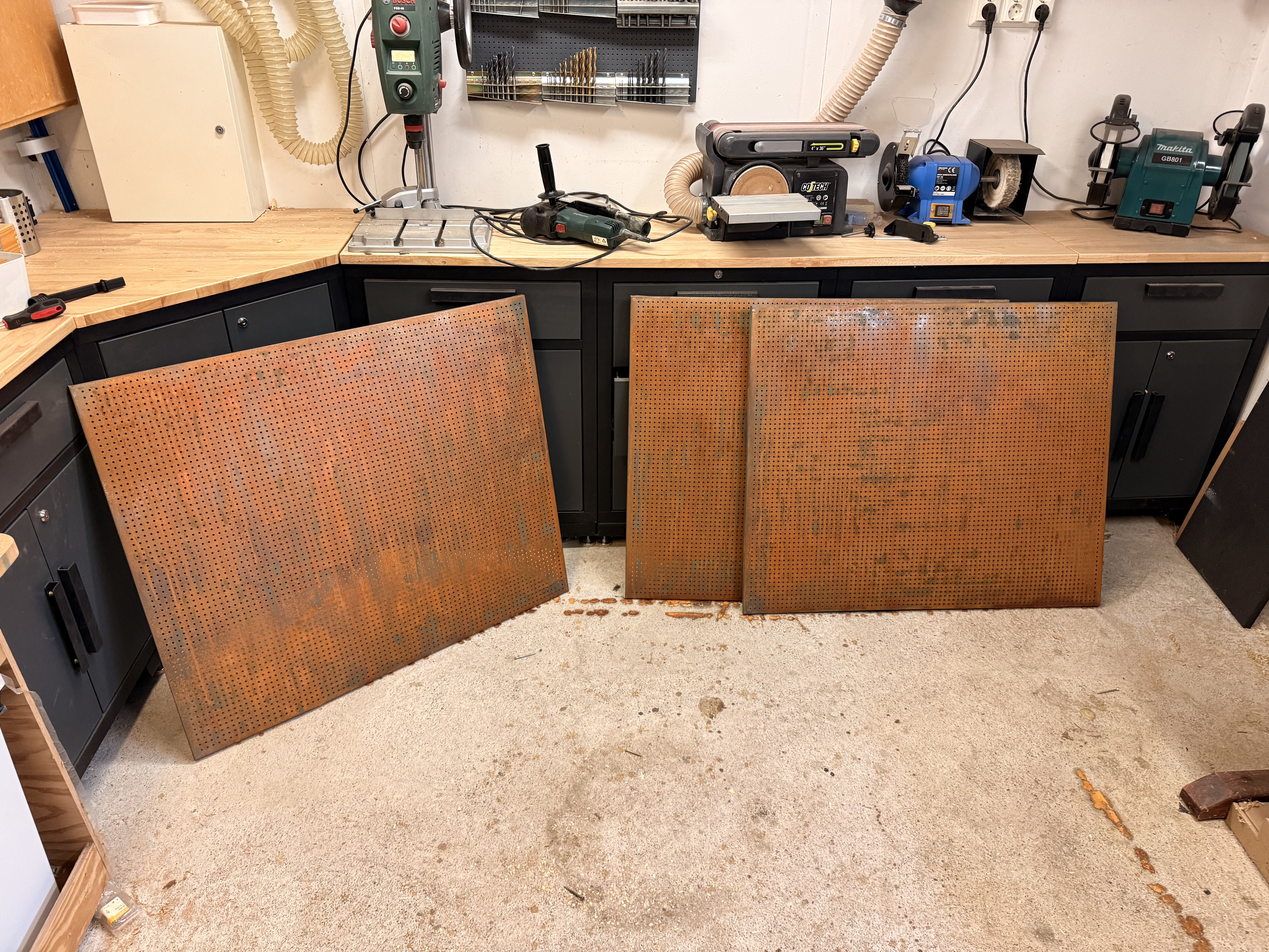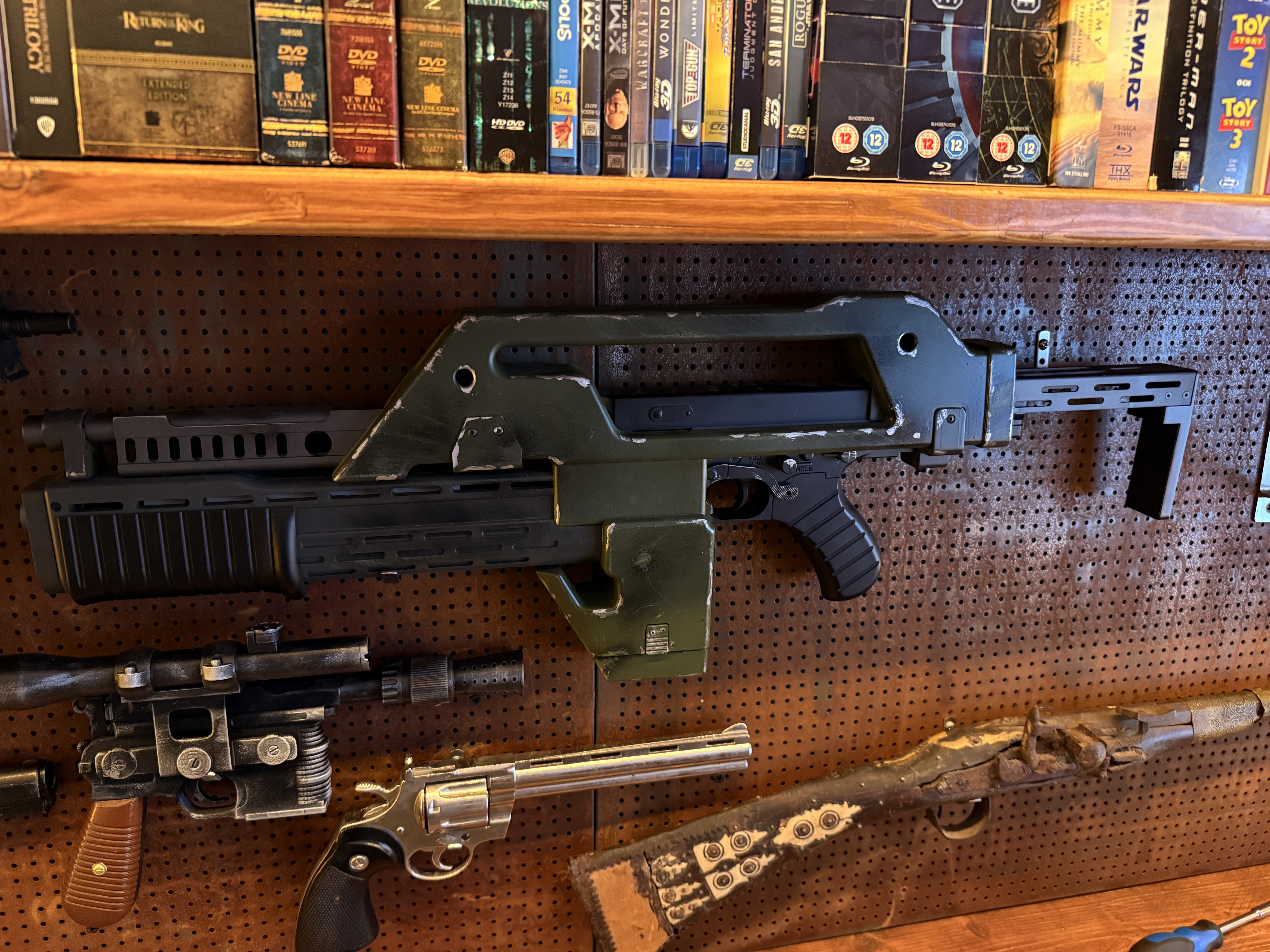 Så jag fick en idé om att köpa verktygstavlor, som man har i verkstaden för verktygskrokar. Slipa dem rena från färg och sedan oxidera dem så de blir rostiga och sätta upp dem på väggen ovanför soffan. På dessa kan jag sedan sätta upp alla vapen-replikor jag har så det blir lite av en vapenvägg, inte minst min M41A Pulse Rifle!
