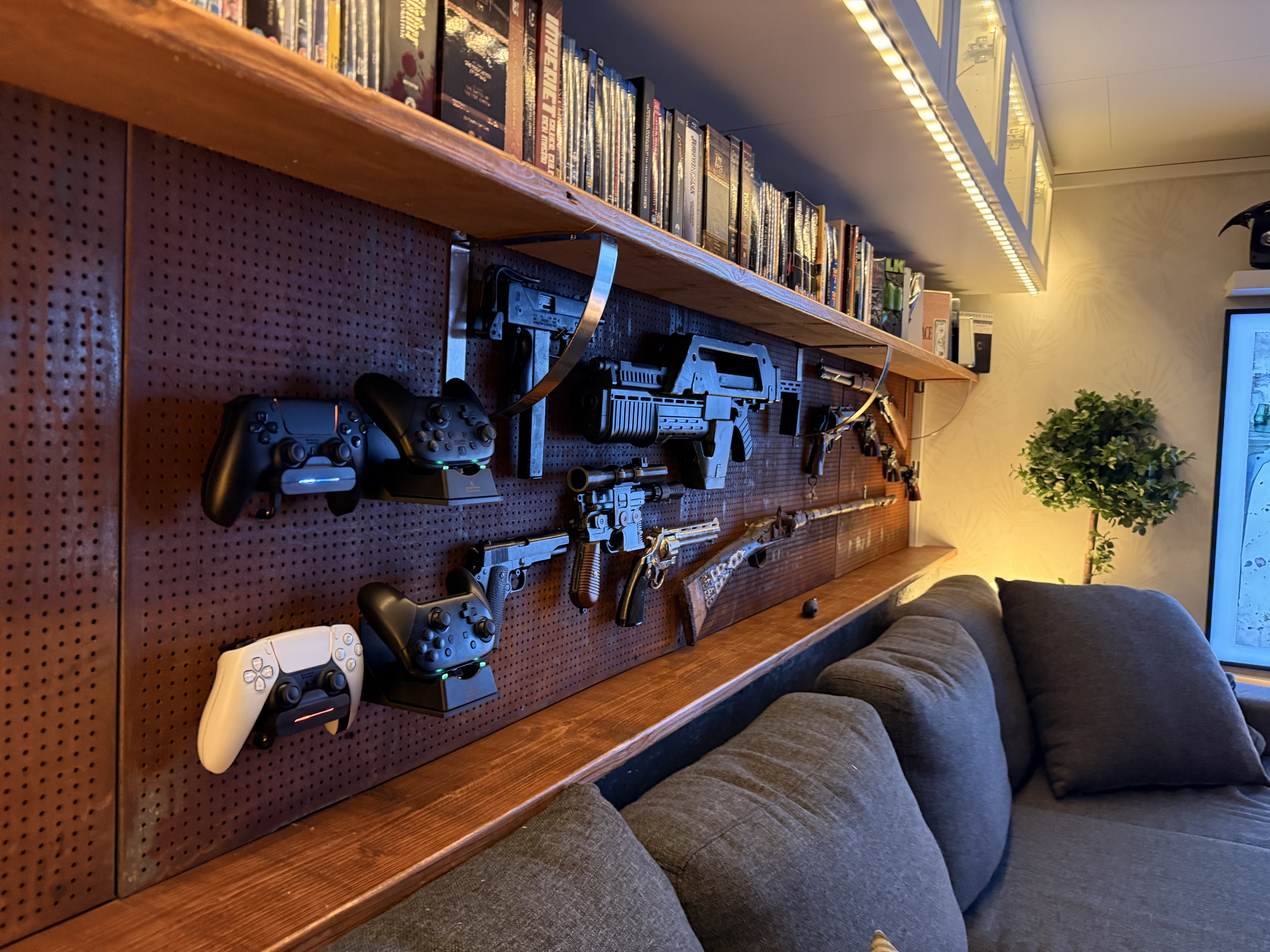 Jag ville också ha laddare på den här väggen för handkontroller till spel, två för PS5 och två för Nintendo Switch. PS5-laddare hittade jag som var menade för väggmontering, men för Switch-kontrollerna fick jag 3D-printa en liten "hylla" som jag kunde fästa på verktygstavlan.